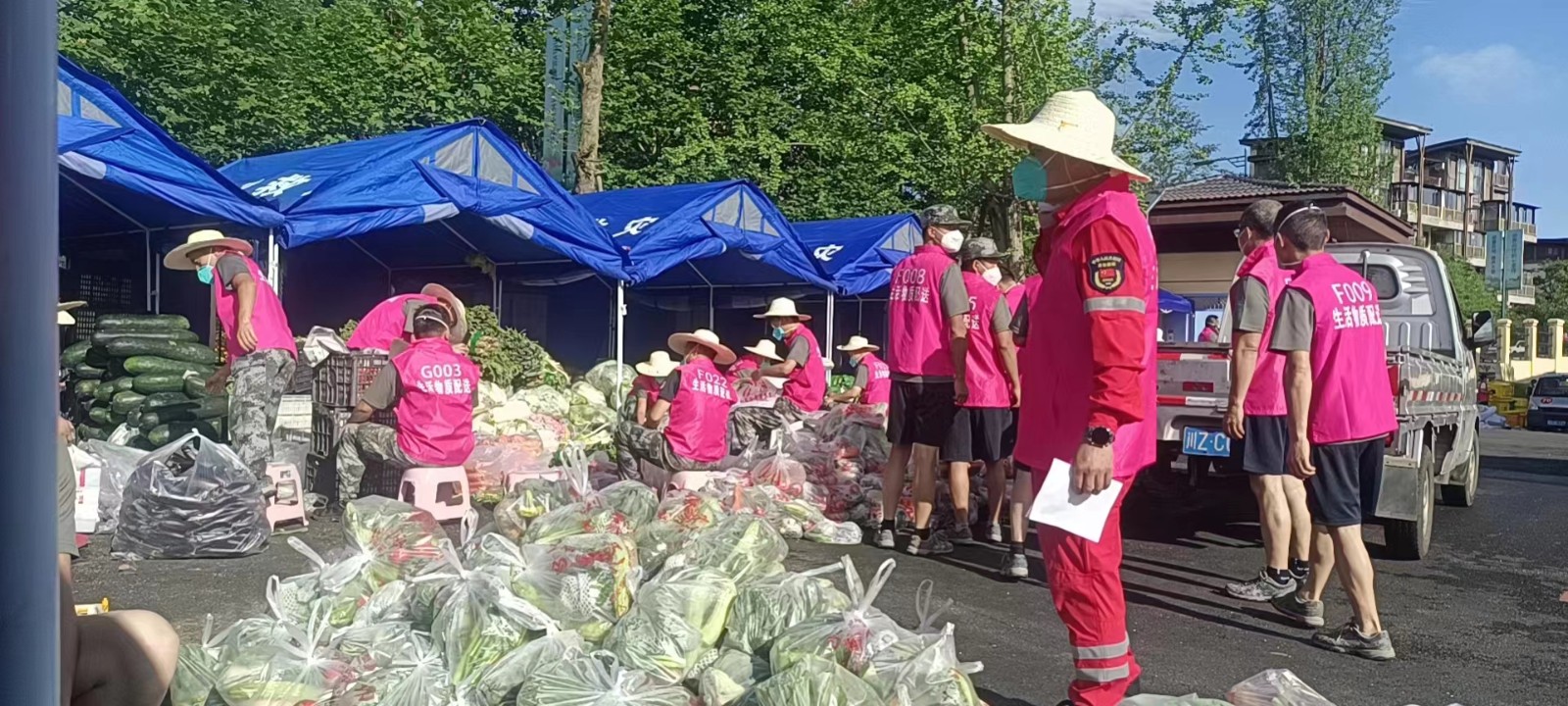 在當(dāng)?shù)匾咔榉揽刂笓]部的帶領(lǐng)下,王成勇、祝長青,身披“志愿紅”,深入封控區(qū)域,從晨光熹微到燈火闌珊,一整天都是后背全濕,每一天都是腰酸背痛。但他們明白,“哪里需要就沖向哪里”。二人先后9次進入高風(fēng)險區(qū)搭建應(yīng)急帳篷,為的是這一頂頂帳篷能夠為來自四面八方、各行各業(yè)的志愿者們遮風(fēng)擋雨,每天一趟趟一袋袋的蔬菜、肉、米、油,讓當(dāng)?shù)鼐用衽c游客每天都能夠安心避疫。