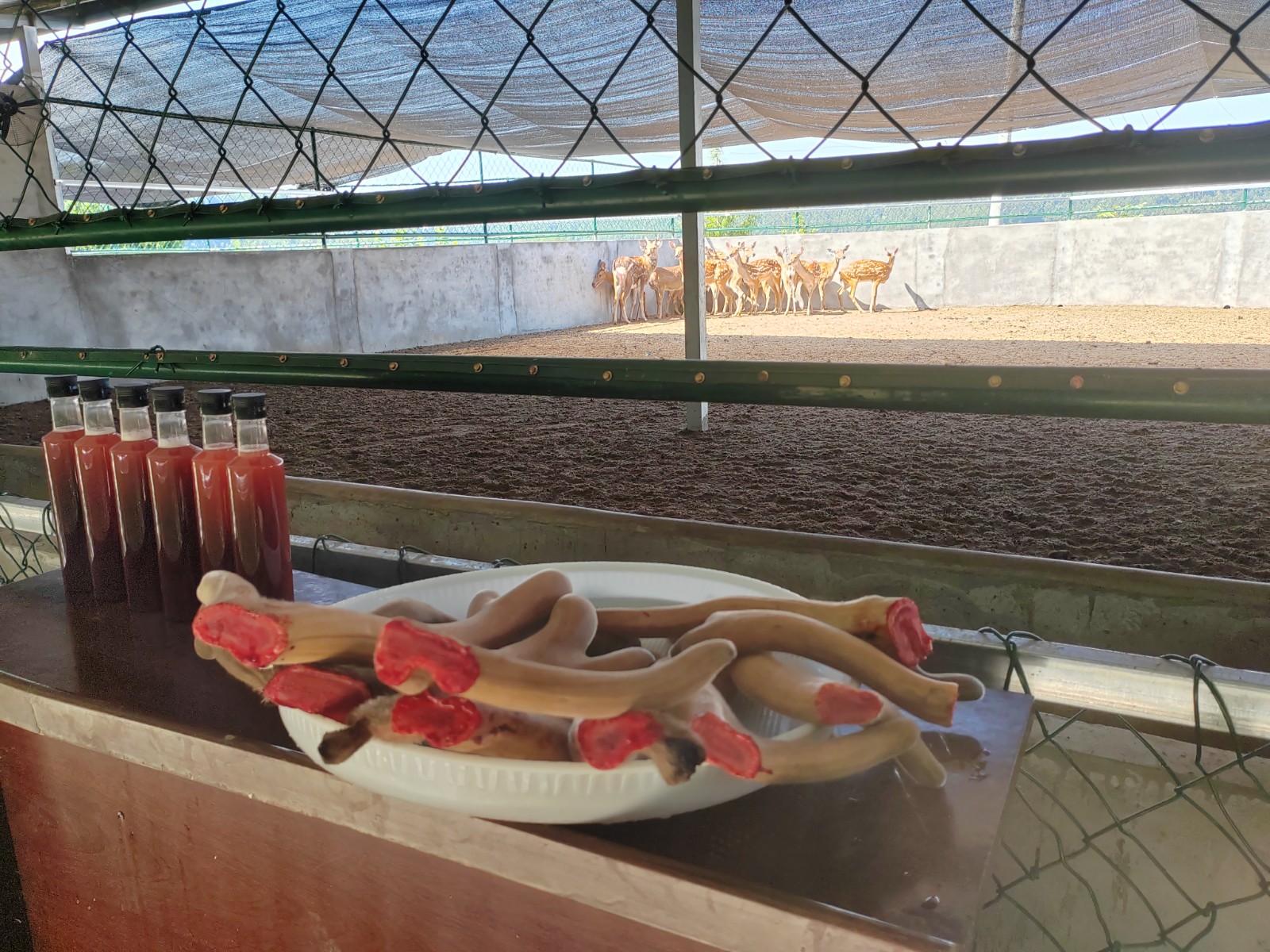 當天上午,插旗山村梅花鹿養(yǎng)殖基地圍滿了前來的村民,在技術(shù)人員的專業(yè)指導下,飼養(yǎng)員們規(guī)范操作,伴隨著鹿茸鋸清脆的“咔嚓”聲,一對對形如珊瑚、色澤鮮亮的鹿茸應聲而落,順利完成了首批6只梅花鹿的鹿茸收割。