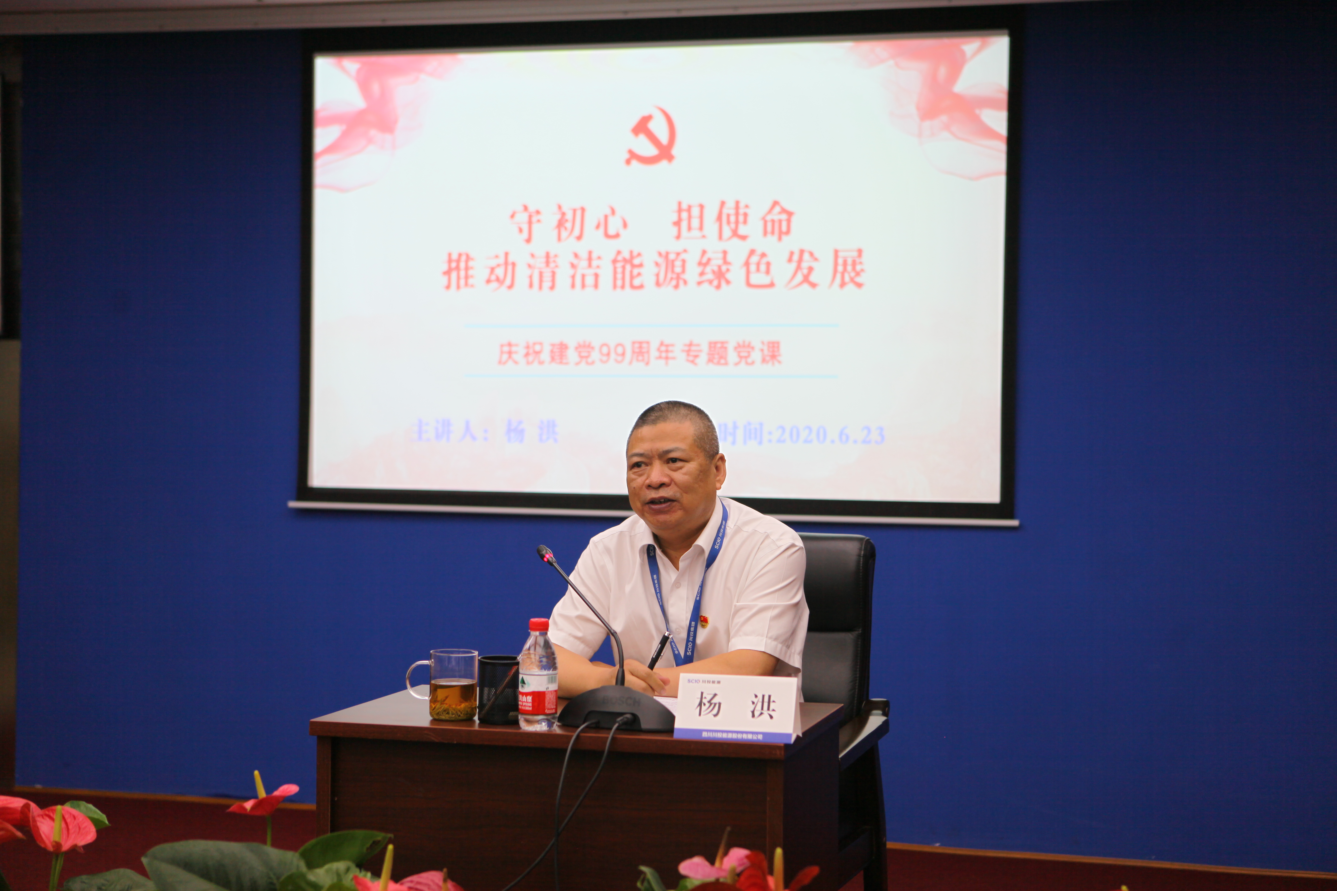 值此川投能源“紅色引擎藍籌先鋒”(簡稱“五個先鋒”)黨建品牌創(chuàng)建工作引向深入之際,6月23日,川投能源黨委采用現(xiàn)場和視頻會議相結合的方式,以黨員承諾踐諾、黨員先鋒隊授旗、發(fā)布公司黨建品牌標識以及公司黨委書記講黨課等內(nèi)容為載體,組織全體黨員、入黨積極份子、新黨員代表隆重召開紀念建黨九十九周年大會,為中國共產(chǎn)黨第99個生日獻上賀禮。公司黨委副書記、工會主席楊超龍主持會議。
