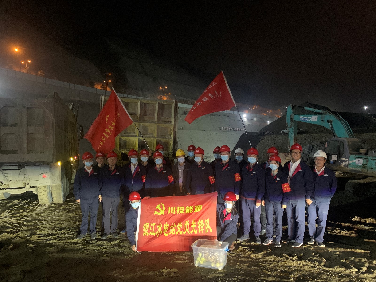 11月13日晚上22時(shí),銀江水電站CIII標(biāo)導(dǎo)流明渠項(xiàng)目工地上仍然燈火通明、機(jī)械轟鳴,為保障“11.30導(dǎo)流明渠過(guò)水”目標(biāo)順利實(shí)現(xiàn),工人們正在挑燈夜戰(zhàn)、緊張有序施工。為堅(jiān)決貫徹川投能源黨委“持續(xù)推進(jìn)‘我為群眾辦實(shí)事’實(shí)踐活動(dòng)”要求,確保大江截流目標(biāo)如期實(shí)現(xiàn),攀水電公司工會(huì)聯(lián)合機(jī)關(guān)第二黨支部組織開(kāi)展了“挑燈夜戰(zhàn)保截流,凝心聚力鼓干勁”主題黨日活動(dòng),組織支部黨員、入黨積極分子及志愿服務(wù)隊(duì)17人奔赴施工一線(xiàn),為深夜仍在堅(jiān)守崗位的施工及值班人員送上了熱騰騰、香噴噴的鹵雞翅、鹵蛋和香梨。攀水電公司黨總支委員、副總經(jīng)理吳巍嶼,黨總支委員、紀(jì)檢小組長(zhǎng)、總經(jīng)理助理?xiàng)钿J及總經(jīng)理助理唐伽帶隊(duì)開(kāi)展活動(dòng)。