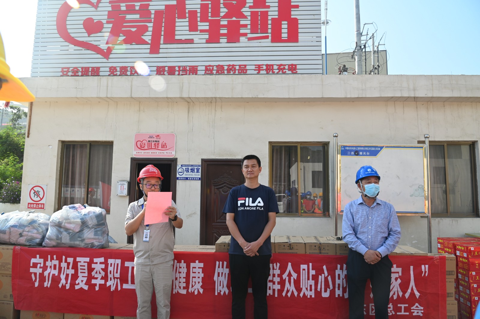 雖然是上午9點,但盛夏的烈日已炙烤著銀江水電站工地。在銀江水電站“愛心驛站”,汪慶元首先致敬全體工友烈日下的“銀江精神”,高度贊揚了一線建設者三年來為銀江水電站建設做出的積極貢獻,并鼓勵他們要戰(zhàn)勝高溫酷暑等重重難關(guān),堅守崗位完成工程建設任務。劉欣在講話中談到:東區(qū)工會心系工友,是大家的“娘家人”,希望大家保重身體,平安度夏,在落實安全防護的前提下積極工作,保質(zhì)保量推進項目施工,為攀枝花的經(jīng)濟建設做出更大的貢獻。