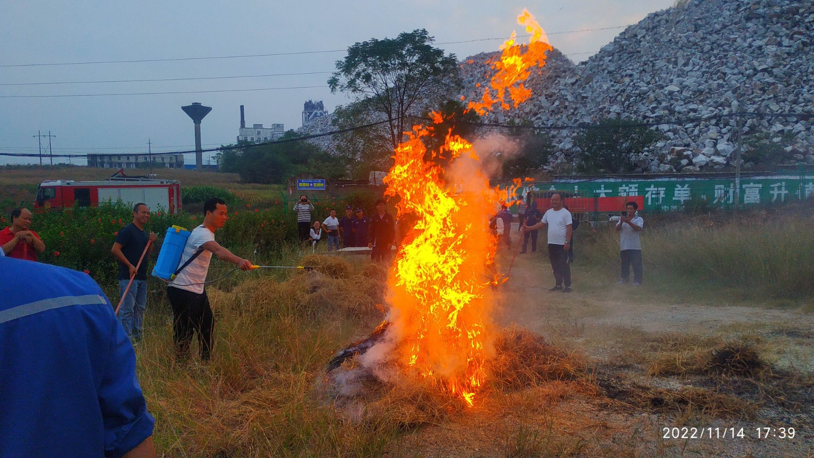 活動緊緊圍繞2022年消防宣傳月主題“抓消防安全,保高質(zhì)量發(fā)展”來開展。首先,根據(jù)桂平升壓站和光伏場火災(zāi)風(fēng)險特點,組織全員觀看《消防四懂三會》《森林防火人人有責(zé)》視頻,使大家認(rèn)識火災(zāi)危害和懂得消防安全基本知識,進(jìn)一步提升消防安全意識;緊接著,李維超結(jié)合典型火災(zāi)事故案例對常用消防器材做了精彩講解和培訓(xùn),包括消防器材使用方法與維保、注意事項和預(yù)防措施等,讓大家充分認(rèn)識到火災(zāi)防范和初起火災(zāi)處置的重要性;最后,結(jié)合桂平光伏電站秋冬火險特點,組建2022年“村企聯(lián)防”應(yīng)急救援隊伍開展現(xiàn)場消防滅火演練,各組分別采用滅火把、滅火器、電動噴淋水壺和微型消防車等滅火器械對模擬火場進(jìn)行滅火處置。