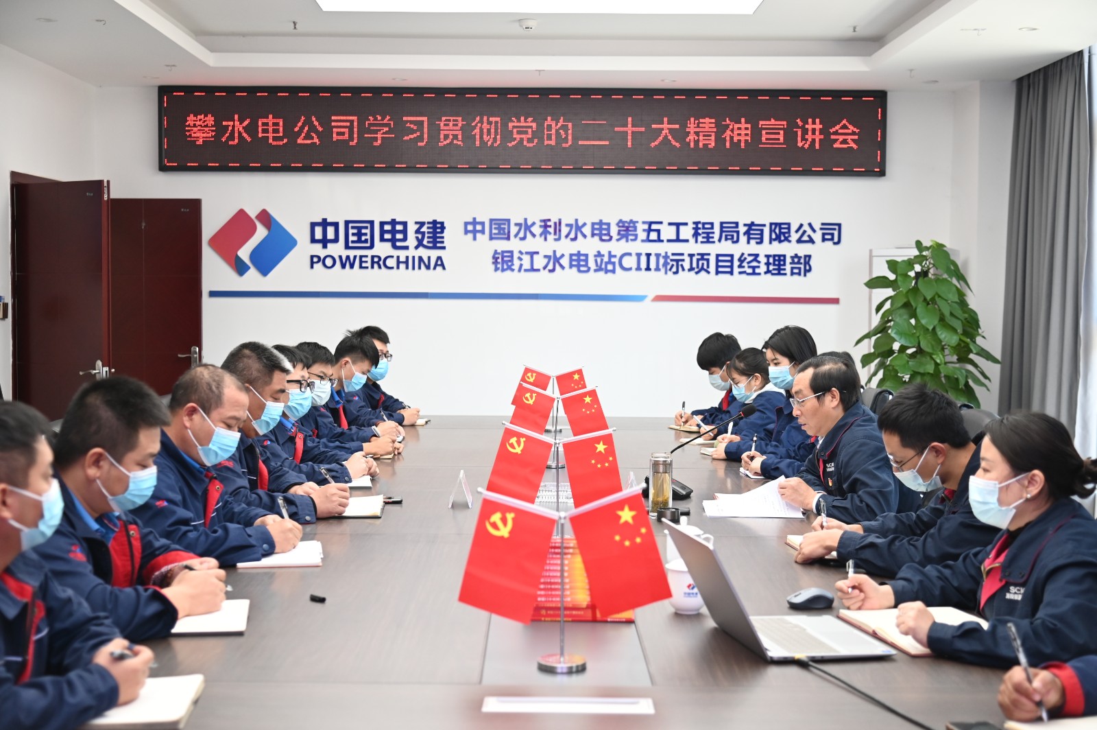 根據(jù)川投集團(tuán)黨委、川投能源黨委有關(guān)要求和攀水電公司黨總支工作安排,為進(jìn)一步學(xué)習(xí)宣傳貫徹黨的二十大精神,激勵(lì)銀江水電站參建單位全面學(xué)習(xí)、全面把握、全面落實(shí)黨的二十大精神,12月1日上午,川投能源副總經(jīng)理、攀水電公司黨總支書記、董事長(zhǎng)、攀新能源公司董事長(zhǎng)徐孝剛到聯(lián)建支部水電五局銀江項(xiàng)目黨支部進(jìn)行黨的二十精神專題宣講。水電五局銀江項(xiàng)目黨支部全體黨員、入黨積極分子、職工代表共計(jì)20余人參加此次宣講會(huì)。