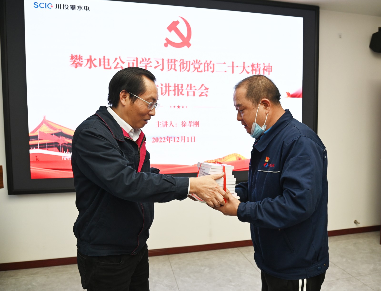 徐孝剛要求,要把廣泛開展面向職工群眾、一線工人宣講黨的二十大精神作為加強(qiáng)思想政治引領(lǐng)、廣泛凝聚民心的重要抓手,結(jié)合工程建設(shè)實(shí)際,切實(shí)確保黨的二十大精神宣講更有特色更有活力。要把學(xué)習(xí)貫徹黨的二十大精神與銀江水電站工程建設(shè)實(shí)際相結(jié)合,與工程建設(shè)重點(diǎn)任務(wù)、重要困難、重要目標(biāo)節(jié)點(diǎn)等結(jié)合起來(lái),高標(biāo)準(zhǔn)、嚴(yán)要求推進(jìn)工程建設(shè)。宣講會(huì)后徐孝剛向水電五局項(xiàng)目部贈(zèng)送了《黨的二十大文件匯編》口袋書、《黨的二十大報(bào)告學(xué)習(xí)輔導(dǎo)百問(wèn)》《二十大黨章修正案問(wèn)答》等書籍。