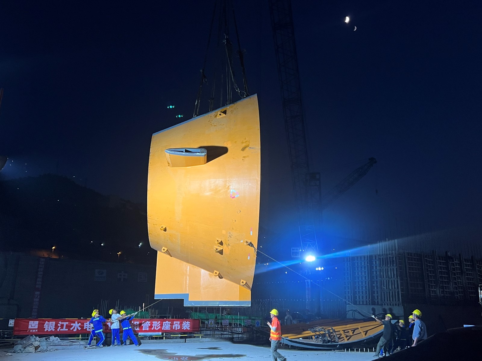 10月20日履帶吊車試吊驗(yàn)收及下固定導(dǎo)葉順利吊裝完成后,從20日16點(diǎn)開始至21日20:00結(jié)束,歷經(jīng)運(yùn)輸、翻身及吊裝三個(gè)階段長達(dá)18個(gè)小時(shí)工作,管形座最重件第一瓣內(nèi)殼在公司領(lǐng)導(dǎo)的現(xiàn)場指導(dǎo)下穩(wěn)穩(wěn)落至安裝位置,后續(xù)公司將組織參建單位一鼓作氣將首臺機(jī)組管形座剩余內(nèi)殼、外殼、前錐體及固定導(dǎo)葉等悉數(shù)吊裝到位,力爭年底完成安裝工作,為實(shí)現(xiàn)2025年一季度首臺機(jī)組投產(chǎn)發(fā)電目標(biāo)打下堅(jiān)實(shí)基礎(chǔ)。