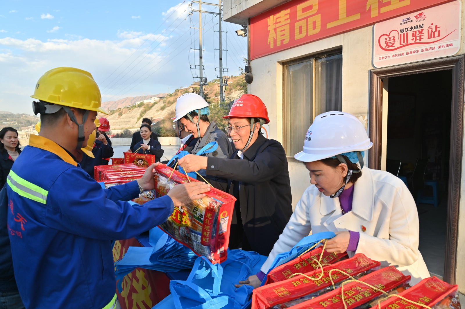 活動(dòng)首先參觀了公司大黨建宣傳陣地和銀江水電站施工現(xiàn)場(chǎng)。在愛(ài)心驛站,黨員們?yōu)閬?lái)自長(zhǎng)江設(shè)計(jì)院、貴陽(yáng)院監(jiān)理部、水電五局項(xiàng)目部、水電七局項(xiàng)目部、廣東源天項(xiàng)目部等參建單位的工友發(fā)放了健康宣傳手冊(cè)、新春大禮包等慰問(wèn)物品。田巨龍感慨到銀江水電站工程建設(shè)速度之快難以令人想象,囑咐工友們一定要保重身體、注意自身防護(hù),祝福工友們平平安安、健健康康迎接新年的到來(lái)。