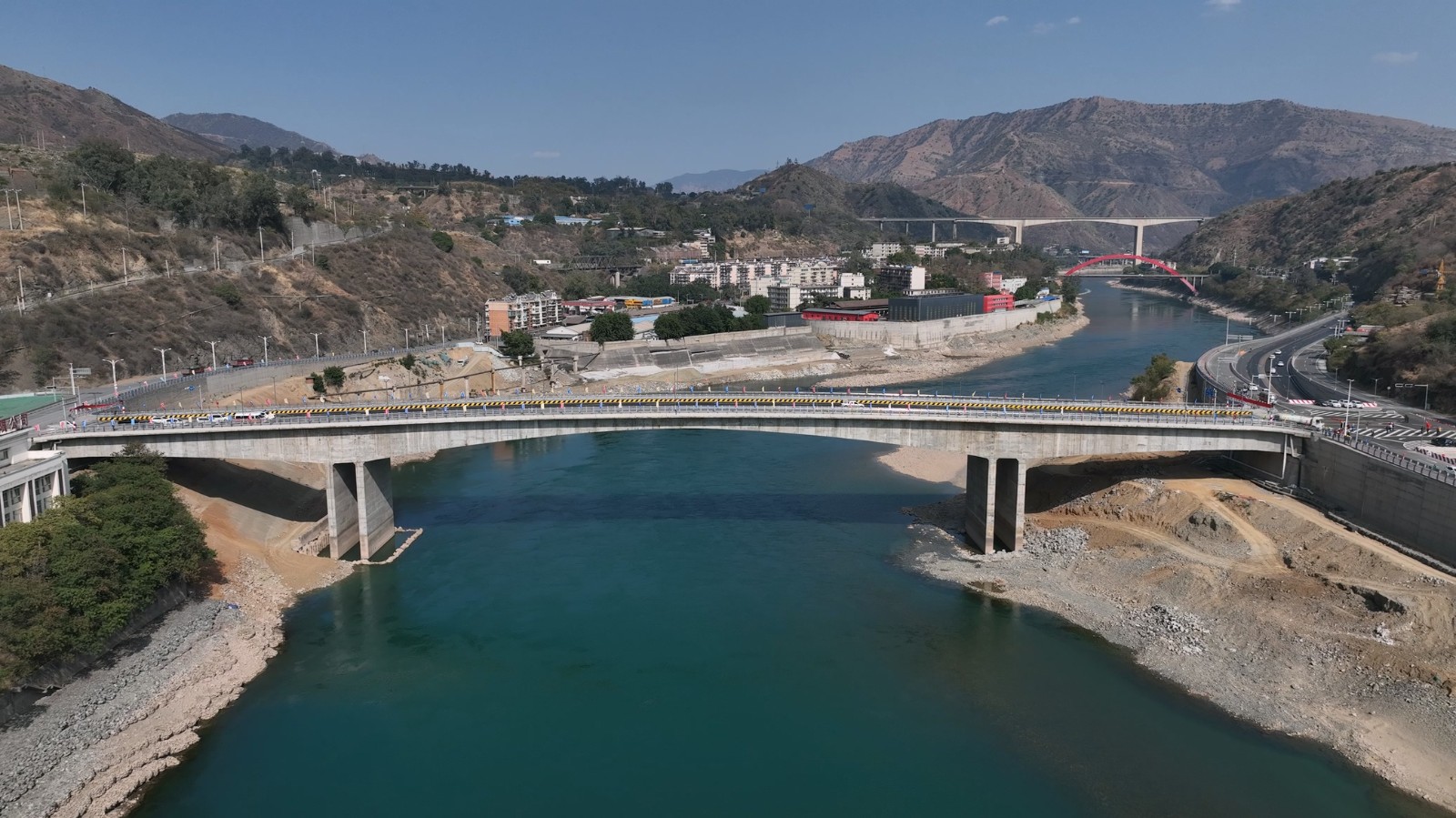 銀江大橋距銀江水電站大壩下游1km處,為雙向四車道預(yù)應(yīng)力混凝土連續(xù)剛構(gòu)橋,全長272m,橋梁寬度23m,左右岸與主橋采用“左岸平交+右岸框架涵立交”的銜接方式。銀江大橋是銀江水電站的重要附屬工程,也是地企共建的民生工程,大橋建成后將成為連接兩岸的重要交通橋,起到加強(qiáng)金沙江南北兩岸快速通道的紐帶作用以及推動城市擴(kuò)容提質(zhì)、不斷提高城市承載能力和輻射帶動作用,將為攀枝花市共同富裕試驗區(qū)建設(shè)貢獻(xiàn)積極力量。