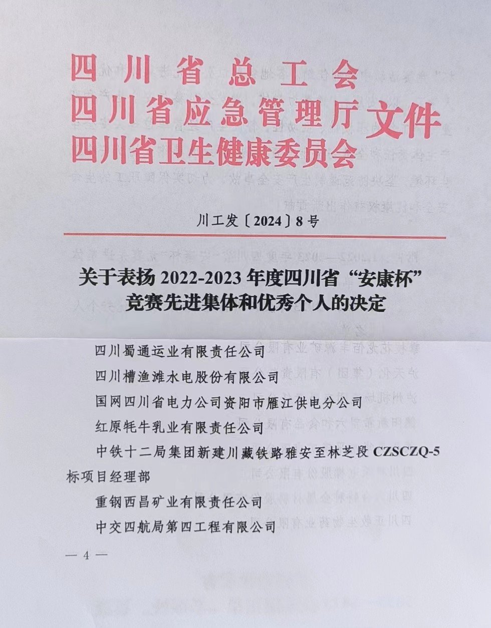 近日,四川省總工會、四川省應急管理廳、四川省衛(wèi)生健康委員會聯(lián)合印發(fā)《關于表彰2022-2023年度四川省“安康杯”競賽先進集體和優(yōu)秀個人的決定》,四川槽漁灘水電股份有限公司(簡稱“槽漁灘公司”)榮獲四川省“安康杯”競賽優(yōu)勝單位榮譽稱號。