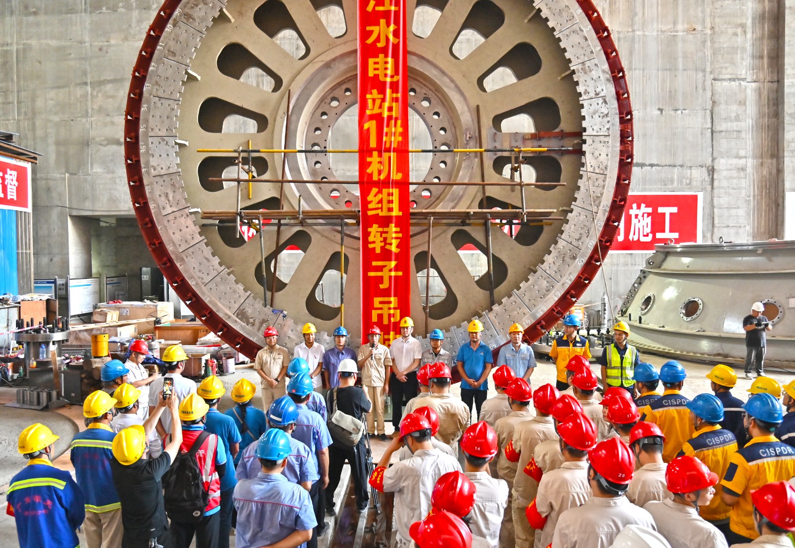 8月25日下午,銀江水電站首臺(tái)機(jī)組轉(zhuǎn)子順利吊入機(jī)坑并與機(jī)組主軸連接就位。