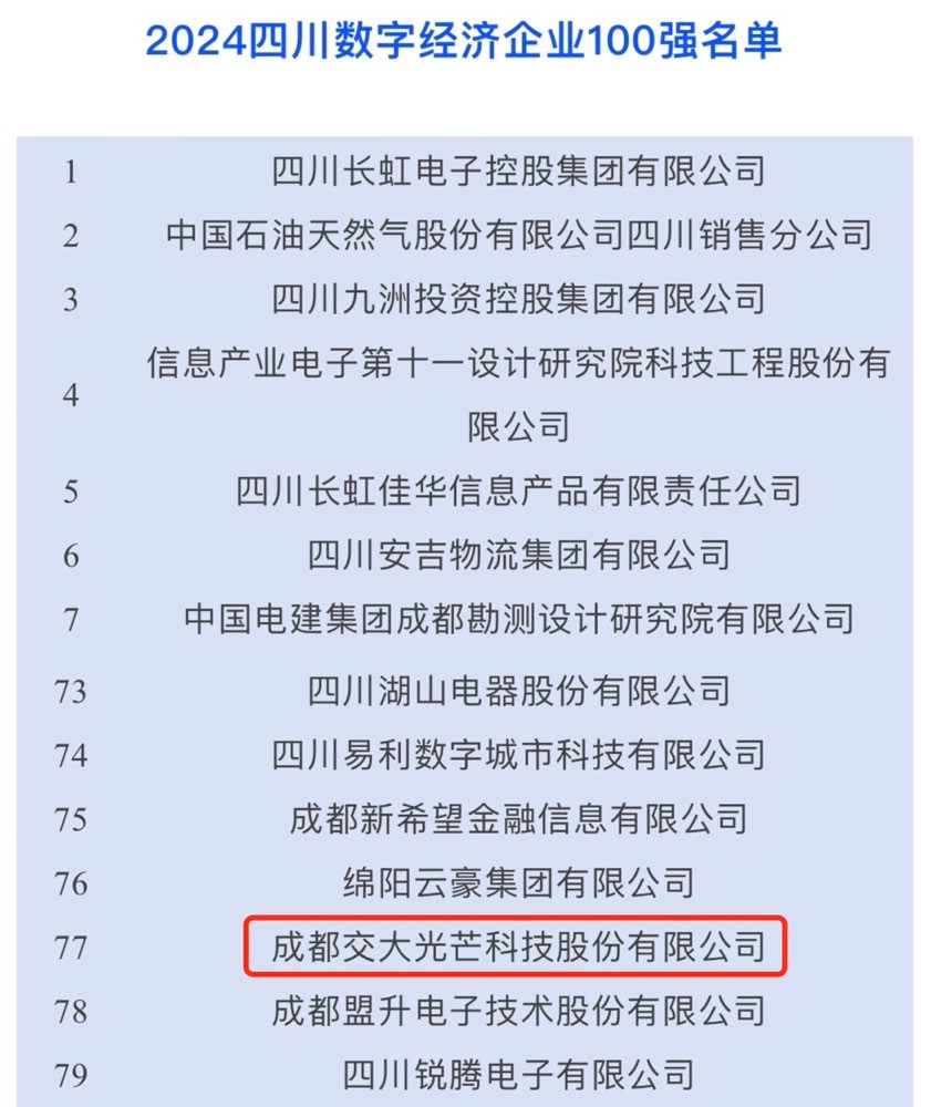 9月26日,四川大企業(yè)大集團(tuán)發(fā)展大會(huì)在成都召開(kāi),會(huì)上,四川省企業(yè)聯(lián)合會(huì)發(fā)布了2024年四川企業(yè)100強(qiáng)、制造業(yè)100強(qiáng)、服務(wù)業(yè)100強(qiáng)和數(shù)字經(jīng)濟(jì)100強(qiáng)榜單,交大光芒榮登四川數(shù)字經(jīng)濟(jì)企業(yè)100強(qiáng)榜單,位列第77位。