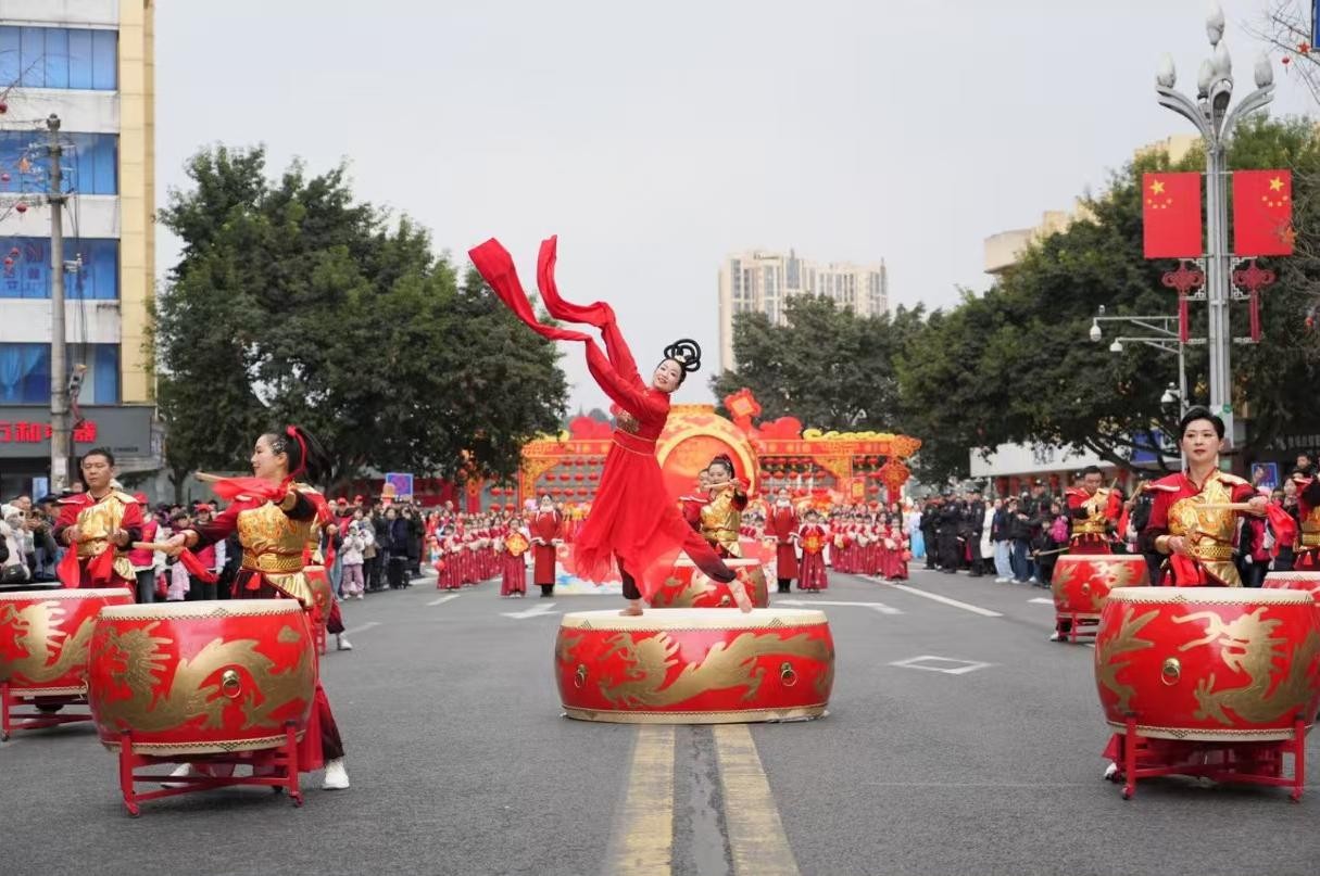 洪雅民俗文化巡展活動(dòng)是洪雅縣每年春節(jié)期間的傳統(tǒng)文化品牌,表演節(jié)目豐富多彩、精彩紛呈,深受全縣人民喜愛。活動(dòng)當(dāng)日,民俗文化巡游隊(duì)伍從三彩廣場(chǎng)出發(fā),一直到洪雅廣場(chǎng),現(xiàn)場(chǎng)人頭攢動(dòng),熱鬧非凡。隨著激昂的鼓點(diǎn)響起,大鼓隊(duì)員們手中的鼓槌上下翻飛,富有節(jié)奏感地敲擊著大鼓。磅礴的氣勢(shì)、靈動(dòng)的韻律、美妙的舞姿瞬間點(diǎn)燃了現(xiàn)場(chǎng)氣氛,吸引了眾多市民駐足觀看、拍手稱贊。