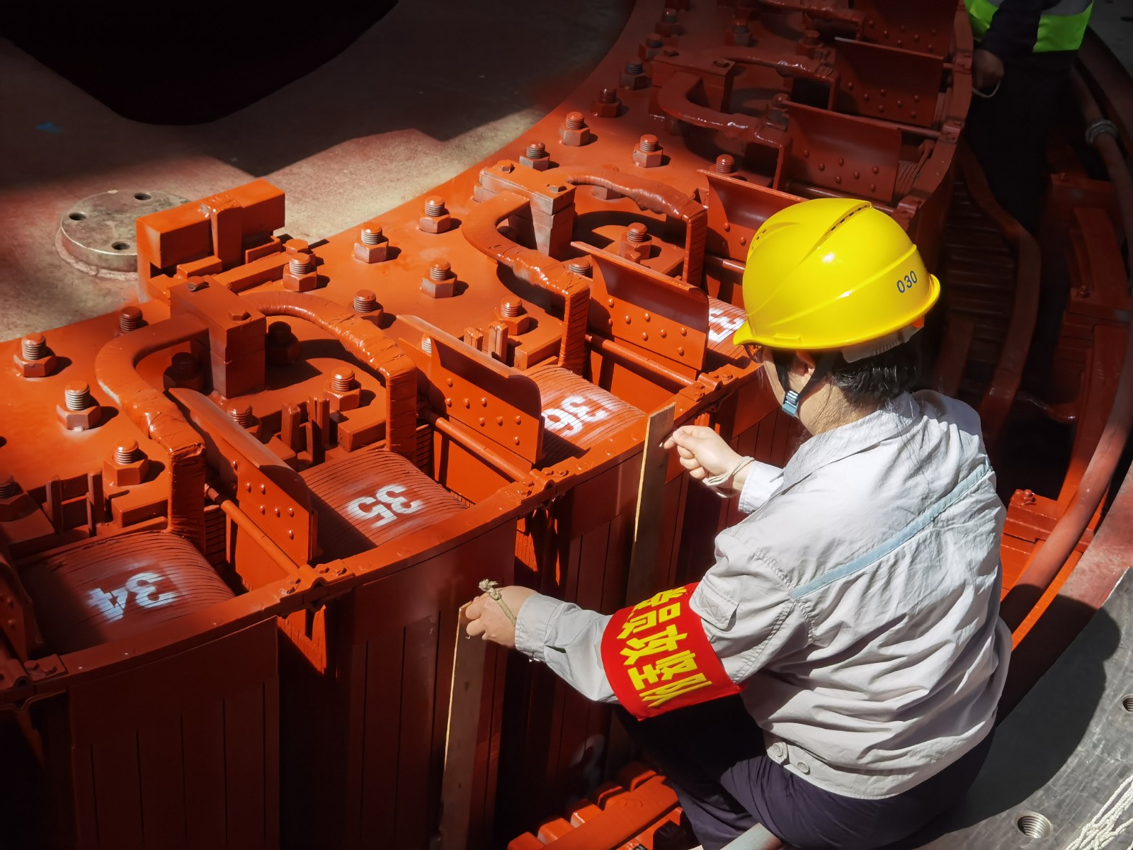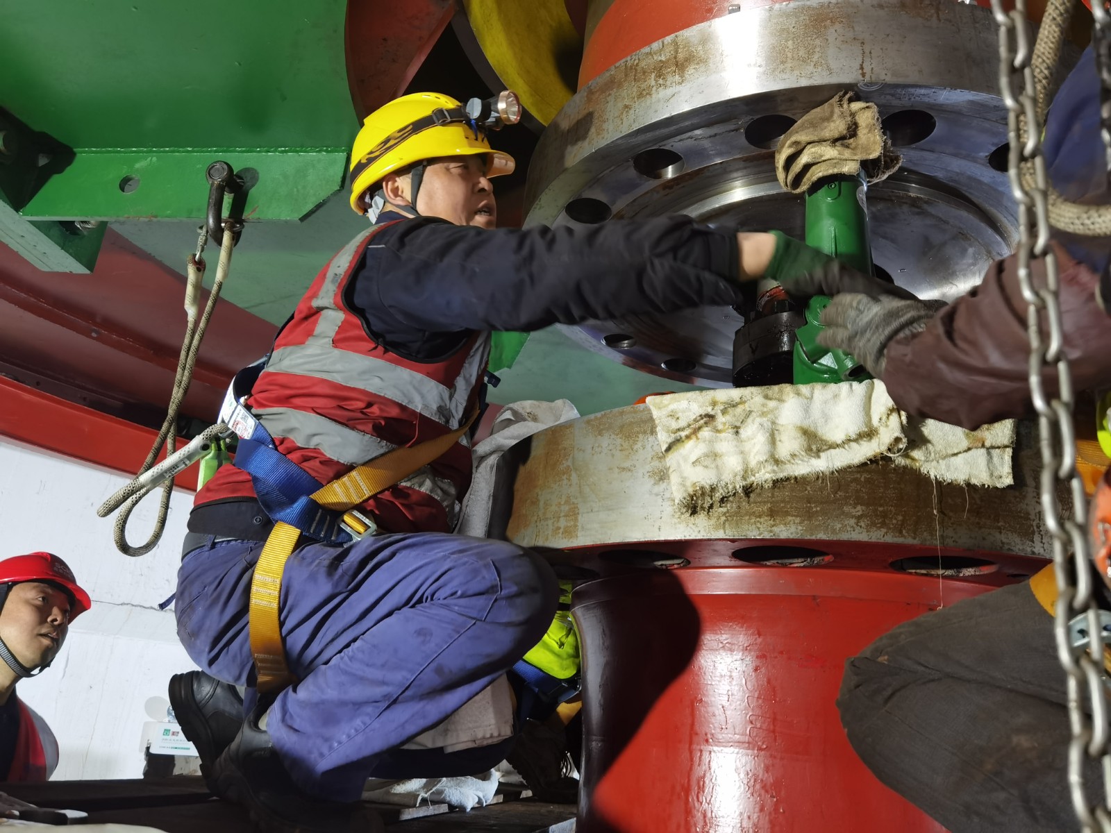 “這‘硬骨頭’我來(lái)啃,請(qǐng)組織放心,堅(jiān)決完成任務(wù)”。4月16日,轉(zhuǎn)子回裝過(guò)程中,老黨員宋加行發(fā)揚(yáng)新時(shí)代工匠精神,主動(dòng)承擔(dān)高風(fēng)險(xiǎn)、高技術(shù)含量的司索崗位,他哨音清晰、手勢(shì)果斷,與起重司機(jī)配合如“榫卯銜接”。檢修團(tuán)隊(duì)成員分工明確、協(xié)同配合,確保轉(zhuǎn)子回裝工作按期順利完成。