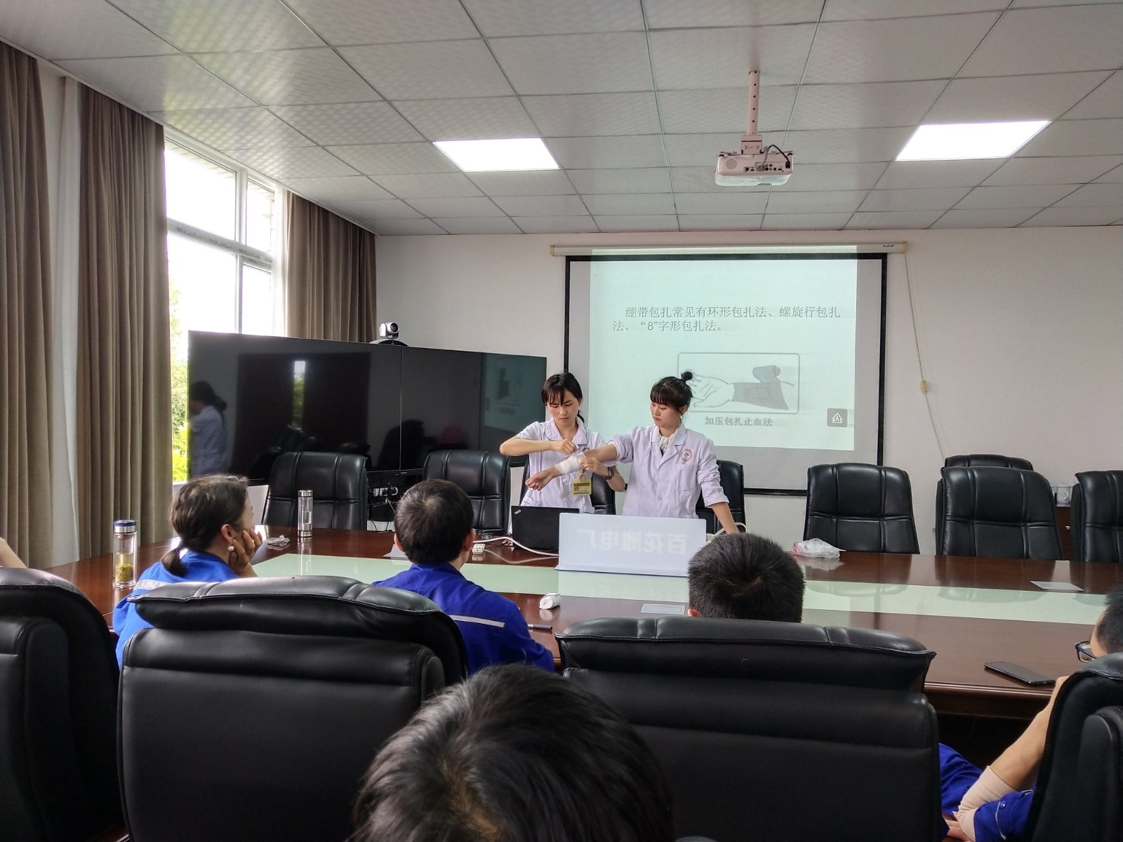 培訓(xùn)老師結(jié)合多年的臨床經(jīng)驗及電站工作特點,通過播放幻燈片和視頻、展示實物、現(xiàn)場演示等形式,以近年來發(fā)生在身邊的鮮活事例,向?qū)W員們強調(diào)了應(yīng)急救護“黃金四分鐘”的重要性,隨后逐一講解了胸外按壓、人工呼吸、止血、包扎、骨折固定、傷員搬運等急救理論與施救技巧,并現(xiàn)場實操心肺復(fù)蘇、繃帶、三角巾包扎等方法,教會工人遇到意外傷害時如何就地取材進行初步應(yīng)急處理,同時還與電站員工現(xiàn)場互動,手把手的傳授相關(guān)操作技能,以確保學(xué)員能夠充分掌握并正確運用。
