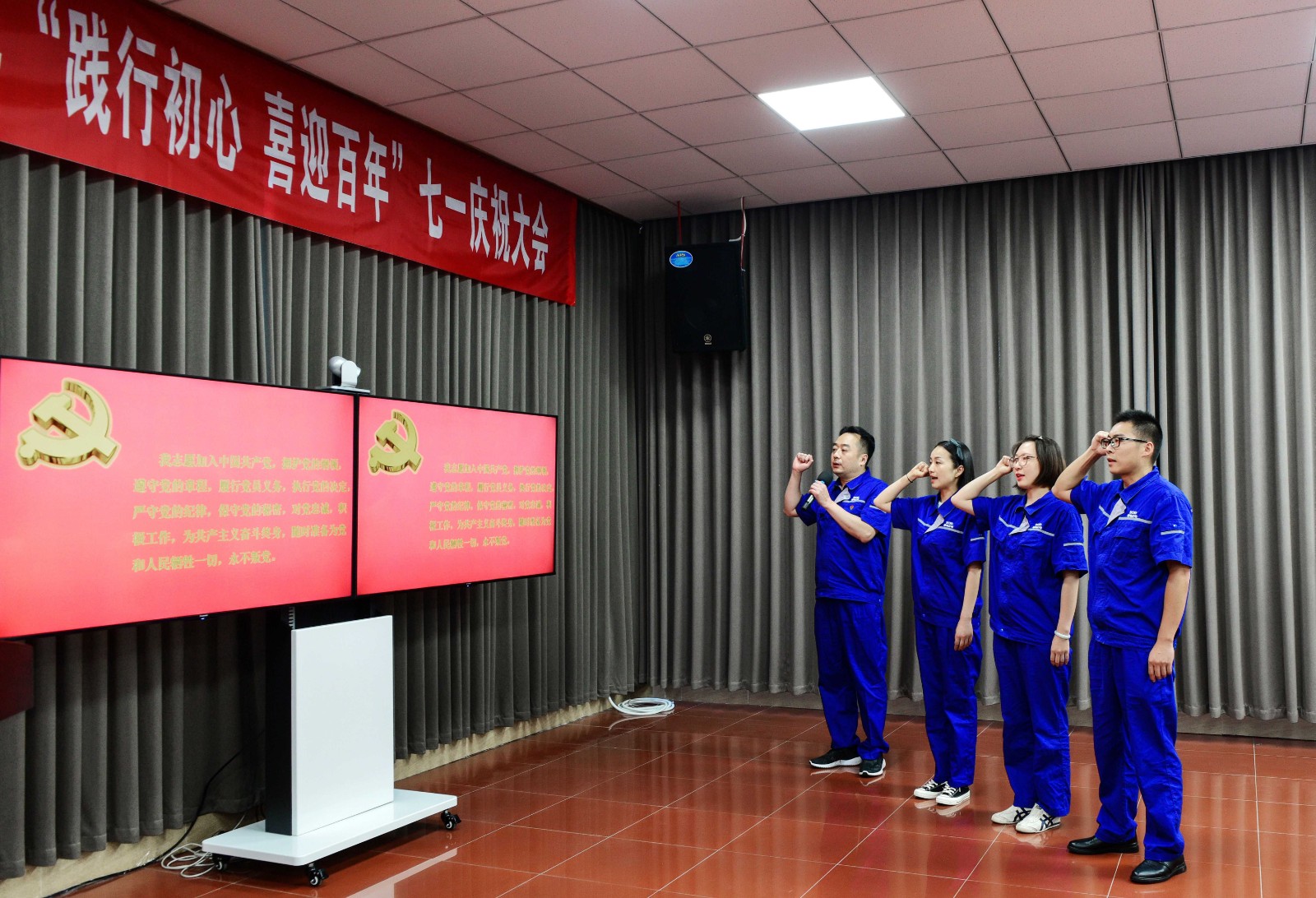 慶祝大會在雄壯的國歌聲中正式開始。大會首先由公司黨委書記、董事長楊濤帶領(lǐng)三名新黨員在鮮紅的黨旗下進行莊嚴的入黨宣誓,參會的全體黨員也和新黨員一起重溫了入黨誓詞。時刻提醒我們要始終保持共產(chǎn)黨員不忘初心、牢記使命的優(yōu)秀品質(zhì)。